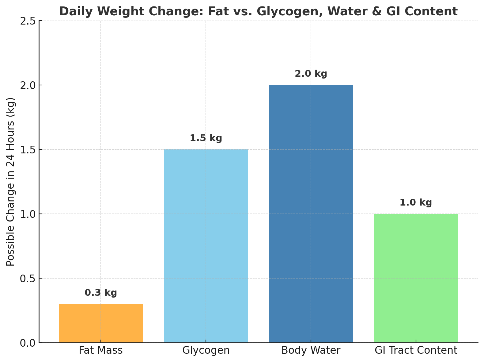 This infographic shows a “realistic” comparison of daily possible body fat changes, vs things like glycogen, water and food in the GI tract. Please note these numbers are theoretical top end changes for all aspects.